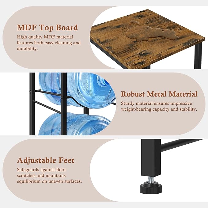 - 【Sturdy Build】: Crafted from reinforced metal and MDF materials, this 2-tier water dispenser rack stand boasts robust durability and can withstand long-term use. Additionally, 4 adjustable feet are provided to prevent floor scratching and maintain stability even on uneven places.