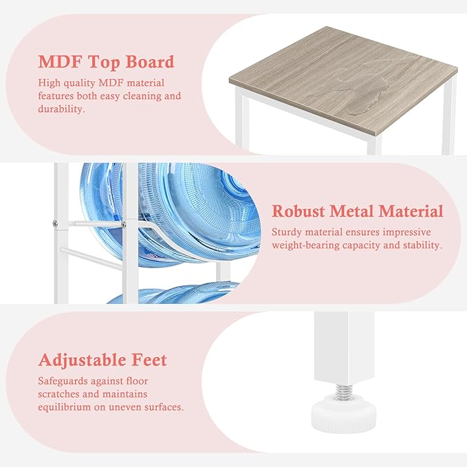 - 【5 Gallon Water Cooler Jug Rack】: More than a water bottle holder, this 5-gallon water bottle storage organizer features an MDF top shelf measuring 13" L x 13.4W". Ideal for placing your coffee station, serving as a versatile pantry table, storing essential kitchen items, or showcasing your preferred decorative cups.