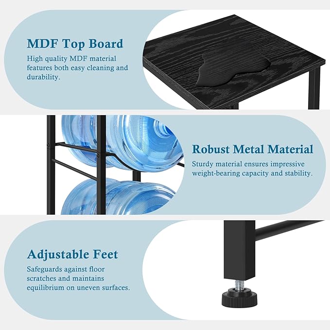 - 【Built to Last】: Crafted from reinforced metal and MDF materials, this 5-gallon water bottle holder with storage shelf boasts robust durability and can withstand long-term use. Additionally, 4 adjustable feet are provided to prevent floor scratching and maintain stability even on uneven places.