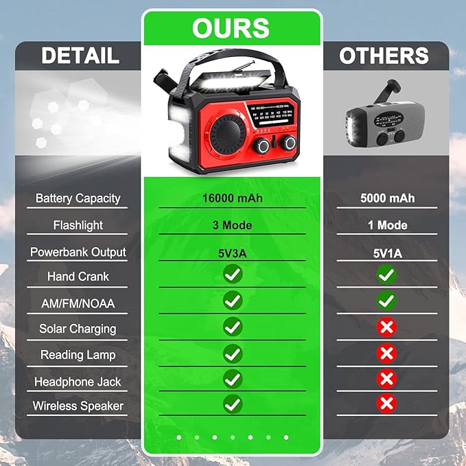 - A MIRACLE OF OUTDOOR SURVIVAL - It's not just a radio, it's a comprehensive survival gadget. It integrates dual SOS alarms, compasses, bright flashlights, reading lamp. (The 16000mAh battery, hand crank, and solar panel provide a strong backbone for these survival features)
