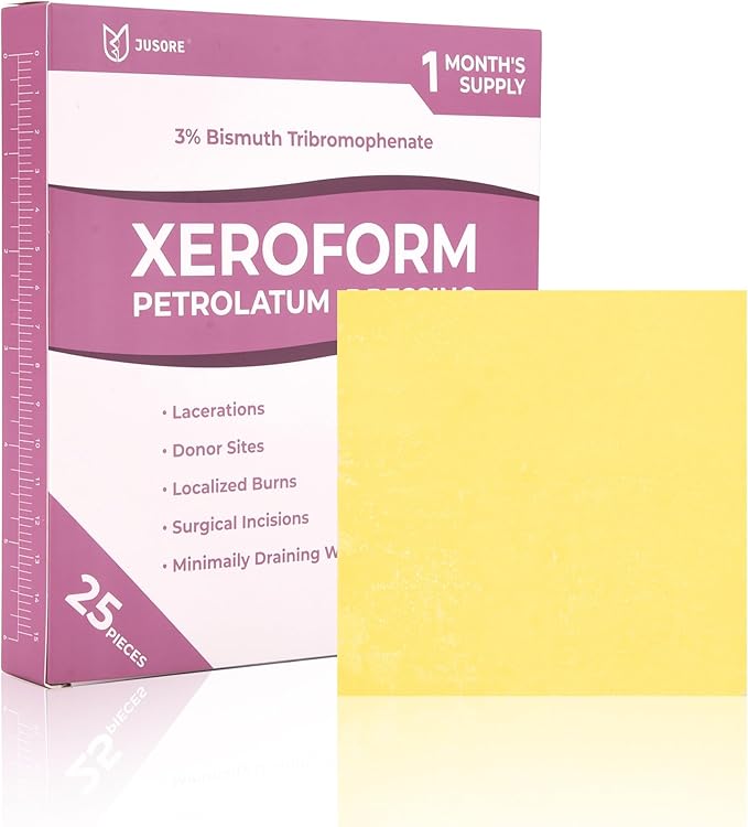 - MEDICAL XEROFORM PETROLATUM DRESSING: This xeroform petrolatum dressing 4x4 is made of a fine, soft, compliant mesh gauze enriched with petroleum jelly oil and 3% bismuth tribromophenate. This formula is the perfect combination of ingredients to protect the skin while promoting healing and adhering to the various contours of the body.