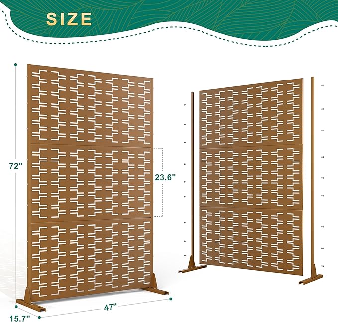 - Stylish Outdoor Privacy Solution: Transform your outdoor space into a stylish haven with this 72-inch high by 47-inch wide metal privacy screen. Its sophisticated and decorative design not only enhances the aesthetics of your balcony, patio, lawn, or garden but also offers effective privacy. The intricate patterns add a touch of elegance, creating a visually appealing barrier that blends seamlessly with any outdoor decor.