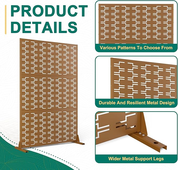 - Durable Metal Construction: Expertly crafted from premium-quality materials, this outdoor privacy screen is engineered to withstand the harshest outdoor conditions. The robust metal construction is resistant to rust, corrosion, and fading, ensuring that it remains a reliable and durable solution for maintaining privacy in your outdoor living space over the years. Its sturdy build guarantees long-lasting performance, even in extreme weather.