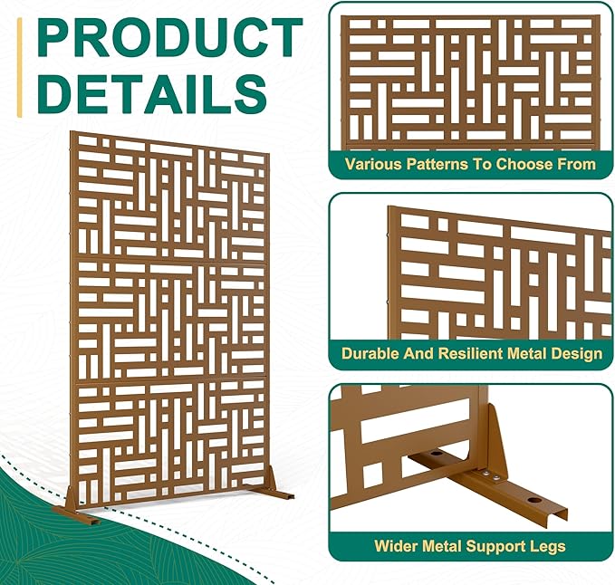 - Durable Metal Construction: Expertly crafted from premium-quality materials, this outdoor privacy screen is engineered to withstand the harshest outdoor conditions. The robust metal construction is resistant to rust, corrosion, and fading, ensuring that it remains a reliable and durable solution for maintaining privacy in your outdoor living space over the years. Its sturdy build guarantees long-lasting performance, even in extreme weather.