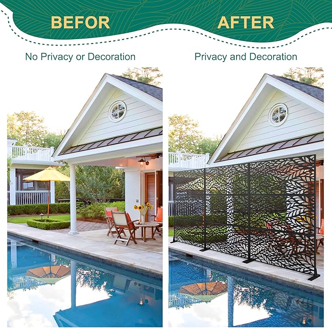 - Functional Decor: Beyond its primary function as a privacy barrier, this outdoor screen serves as an artistic decorative element. The intricate and elegant design elevates the visual appeal of your outdoor decor, turning an ordinary space into a chic and inviting retreat. Its aesthetic versatility makes it a perfect addition to any outdoor setting, where it can complement a variety of styles and themes.