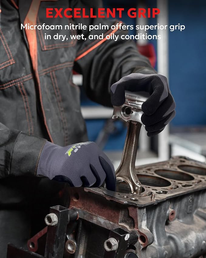 • Breathable & Ultra-light: Micro-foam nitrile dipped nylon gloves,light like a second skin fitment, allowing protection yet able to feel minute objects well.