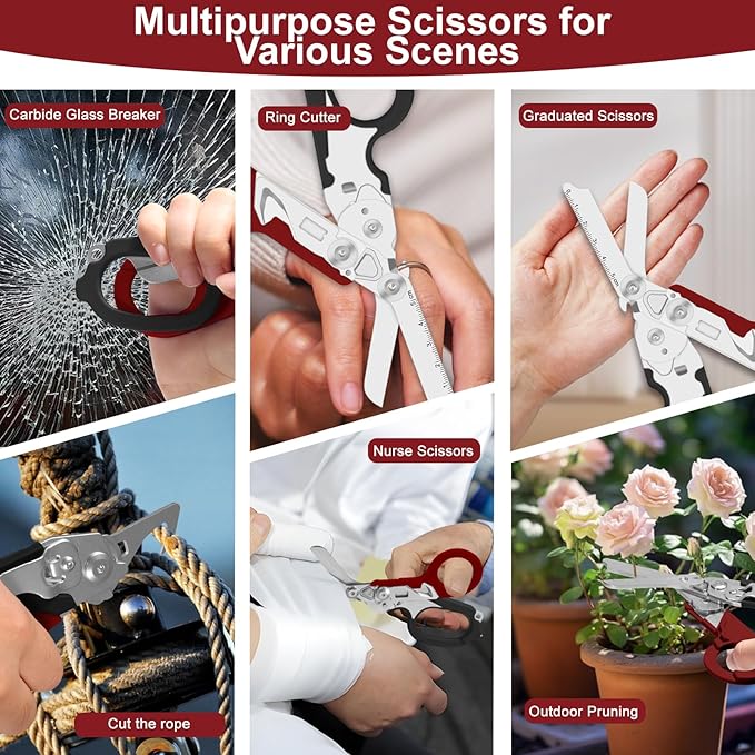 - 1. * * Versatile and versatile: * * It integrates six functions: scissors, oxygen can opener, window breaker, knife, saw, and scale, meeting various needs in outdoor activities. It is lightweight and easy to carry, making it a reliable assistant for outdoor enthusiasts.