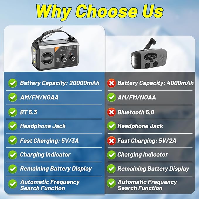 - 【Massive 20000mAh Battery Life】Massive 20000mAh rechargeable battery delivers exceptional long battery life: Enjoy up to 180 hours of radio play at medium volume, 49 hours of reading light, or 39-108 hours of flashlight use on a single charge. Significantly reduces frequent charging needs during extended emergencies, camping, or power outages, providing unparalleled reliability.