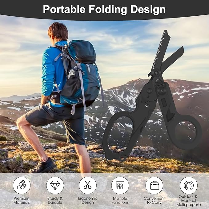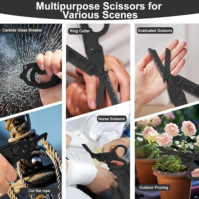 6 in 1 Multifunctional Combination Tool, Folding Retractable Emergency Shears, Outdoor Camping Tools, Seat Belt Cutter, Oxygen Cylinder Wrench, Complimentary Adjustable Wrench (Electroplating black)