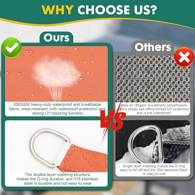 - 【VERSATILE OUTDOOR SOLUTION】When you are in the backyard, porch, pergola, garage, patio, garden, deck, pool, barbecue area, ark, sandbox, coffee bar or any outdoor facility, our triangular sunshade sails are the best versatile solution that Protects all generationos in your family from harmful UV!
