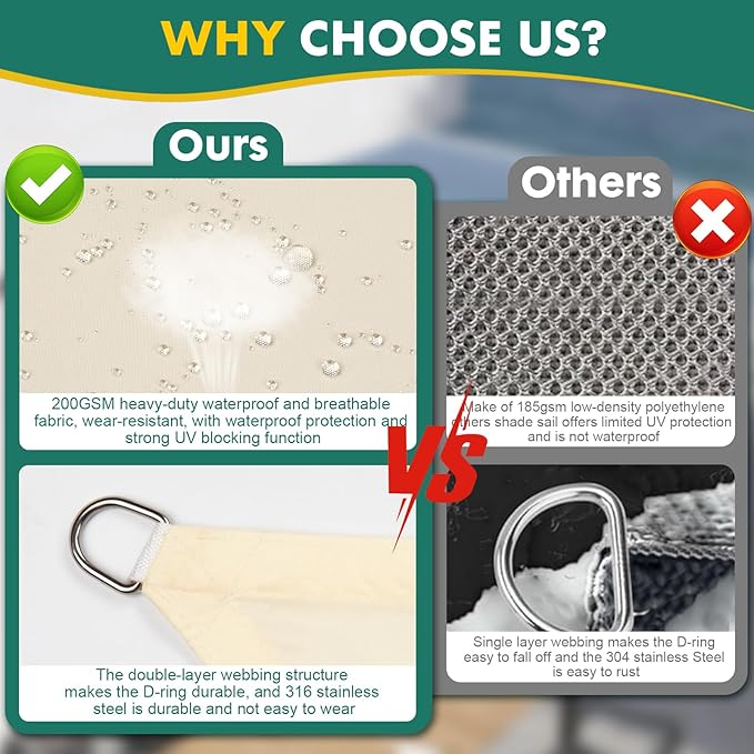 - 【VERSATILE OUTDOOR SOLUTION】When you are in the backyard, porch, pergola, garage, patio, garden, deck, pool, barbecue area, ark, sandbox, coffee bar or any outdoor facility, our triangular sunshade sails are the best versatile solution that Protects all generationos in your family from harmful UV!