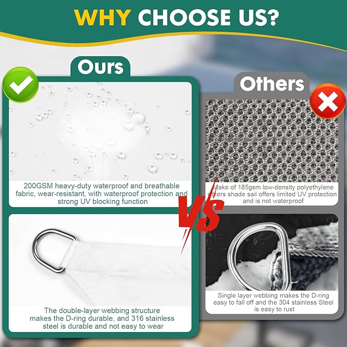 - 【VERSATILE OUTDOOR SOLUTION】When you are in the backyard, porch, pergola, garage, patio, garden, deck, pool, barbecue area, ark, sandbox, coffee bar or any outdoor facility, our triangular sunshade sails are the best versatile solution that Protects all generationos in your family from harmful UV!