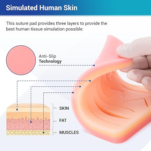 - DURABLE AND HIGH QUALITY - The durable, reusable, and high-quality suture pad is designed to replicate the anatomical structure of human tissue. It provides three layers to provide the best human tissue simulation possible: Skin, Fat, and Muscle. The suture pad also features an improved built-in "mesh layer" between the skin and the fat layers. This feature improves the durability of the suture training pad and prevents rips of the skin layer for the most realistic simulation.
