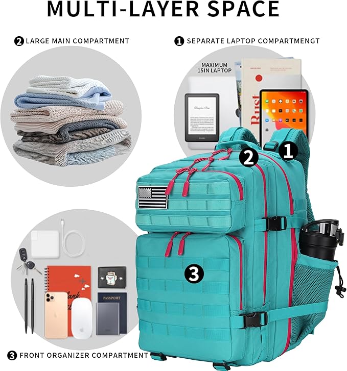 - 【High-Quality Backpack】The 25l tactical backpack is made from 900D oxford and water resistant PVC lining, ensuring your belongings stay safe and dry during outdoor adventures or travels. This military tactical backpack is perfect for friends, family, or loved ones who enjoy hiking, traveling, camping, or gym workouts.