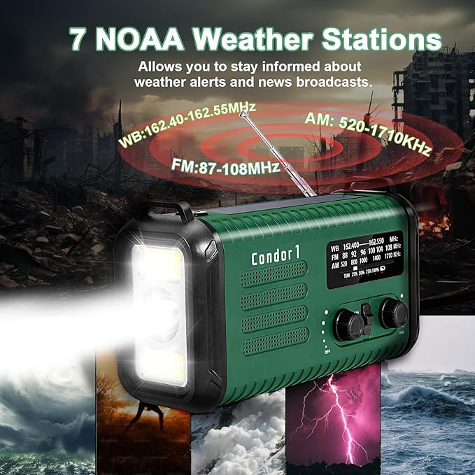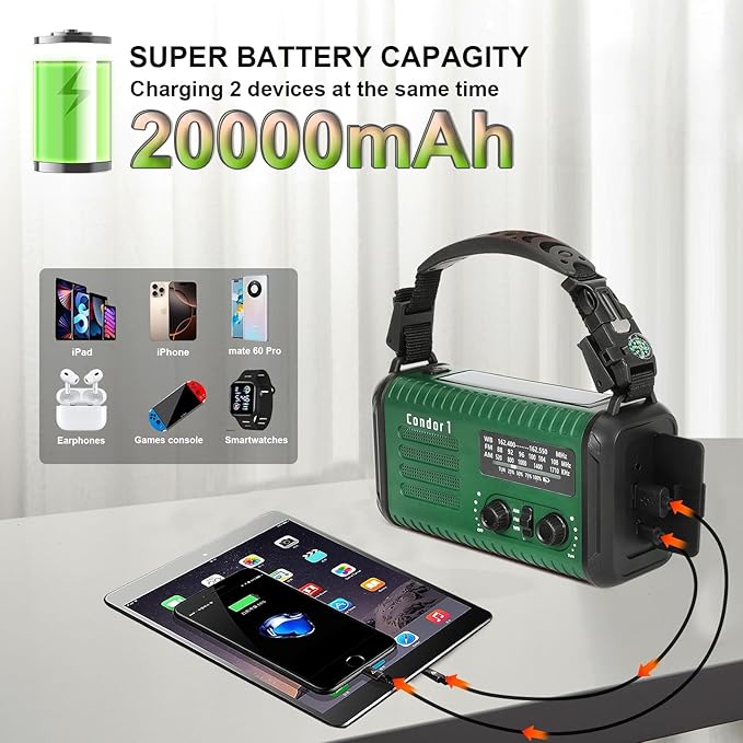 - A MUST FOR HOME & OUTDOORS: This built-in 20000mAh / 74000mWh Large capacity polymer rechargeable battery, hand crank emergency radio picks up AM/FM/NOAA radio stations, 4-mode flashlight & reading lamp,SOS alarm. In addition, add new features, such as the battery indicator, 3.5mm headphone jack. The Condor 1 is the best value for emergency radio in this market.