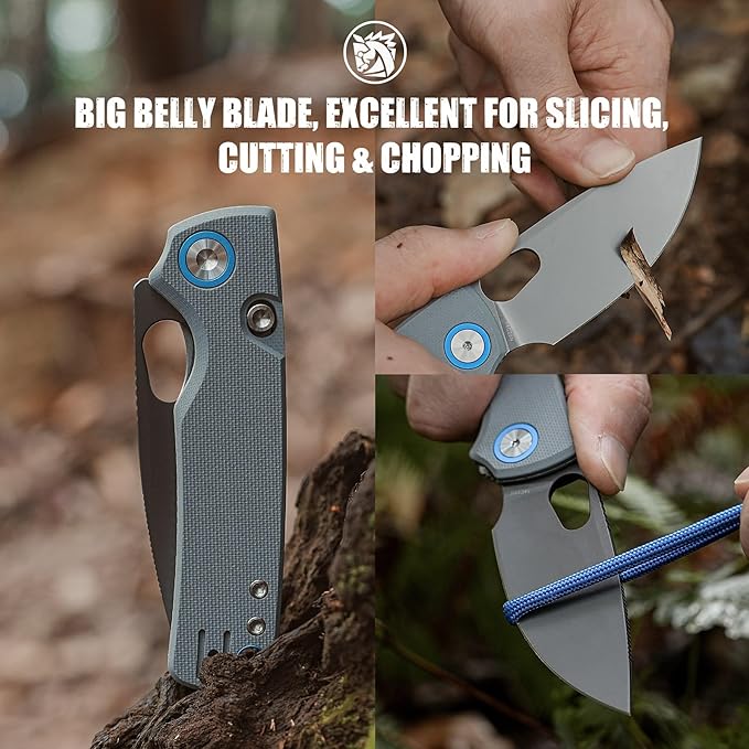 - ❆Pointy Tip and Big Belly Blade❆ The generous blade belly makes slicing tasks-such as cutting meat, fruits, and vegetables—an absolute breeze. The pointy tip delivers precision for tasks like opening packages, cutting ropes, and slicing through cardboard. The 2.99" 14C28N blade offers excellent edge retention, corrosion resistance, and ease of sharpening.