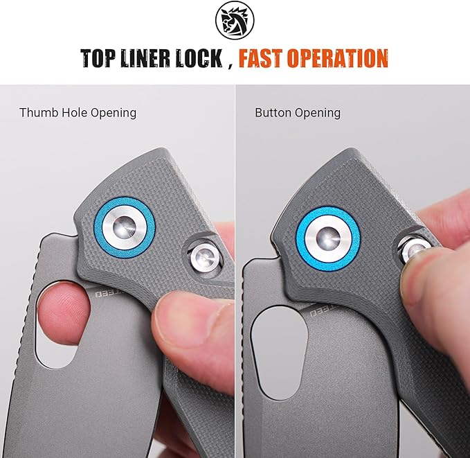 - ❆Detailed Features❆ Jimping ensures maximum grip and control at all key touchpoints. A stabilizing pin reinforces the handle, preventing deformation over time. All T8 screws simplify maintenance, requiring just a single screwdriver. Internally milled liners reduce weight while maintaining strength for EDC and hard use. The large thumbhole allows smooth opening, even for users with large hands or gloves. The recessed button minimizes accidental openings, enhancing overall safety.