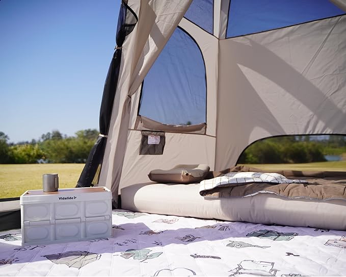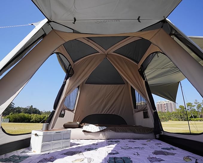 - ROOMY FOR 4-6 PERSON TENT: The tent is perfect for 4-6 person outdoor camping. With the size of 10.5ft x 6.8ft x 70.8in(H) (71.4 sq ft). 2 queen air mattresses (6.7ft*5ft/200cm*150cm, thickness below 7.8in) or 4-6 sleeping bags are well fit in the tent. Ideal for family outdoor camping.