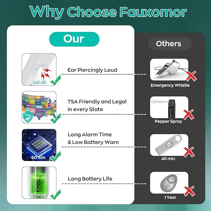 - Safety First: Unlike traditional pepper sprays or tasers, the Fauxomor safety keychain alarm set for women provides a non-violent yet highly effective way to ensure your safety. When threatened, its 140-decibel loud siren birdie sound and high-intensity strobe LED light can distract and scare off attackers while quickly drawing attention from other people to help you.