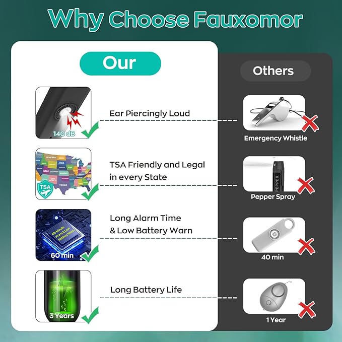 - Safety First: Unlike traditional pepper sprays or tasers, the Fauxomor safety keychain alarm set for women provides a non-violent yet highly effective way to ensure your safety. When threatened, its 140-decibel loud siren birdie sound and high-intensity strobe LED light can distract and scare off attackers while quickly drawing attention from other people to help you.