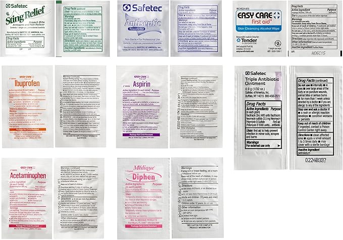 - Included Components : 1 – Bandage, Conforming Gauze, Sterile, 2", 1 – Moleskin, Pre-Cut/Shaped, 1 – Splinter/Tick Remover Forceps, 1 – Sterile Non-Adherent Dressing, 3" x 4", 2 – Antihistamine (Diphenhydramine 25 mg), 2 – Bandage, Butterfly Closure, 2 – Pain Reliever/Fever Reducer (Acetaminophen 500 mg), 2 – Pain Reliever/Fever Reducer (Aspirin 325 mg), 2 – Pain Reliever/Fever Reducer (Ibuprofen 200 mg), 2 – Sterile Gauze Dressing, 2" x 2", 2 – Sterile Gauze Dressing, 3" x 3", 2 – Tincture of Benzoin, 3 – Adhesive Bandage, Fabric, Knuckle, 3 – Safety Pin, 3 – Triple Antibiotic, Single Use, 5 – Adhesive Bandage, Fabric, 1" x 3" 1 – Bandage, Conforming Gauze, Sterile, 2", 1 – Moleskin, Pre-Cut/Shaped, 1 – Splinter/Tick Remover Forceps, 1 – Sterile Non-Adherent Dressing, 3" x 4", 2 – Antihistamine… See more
