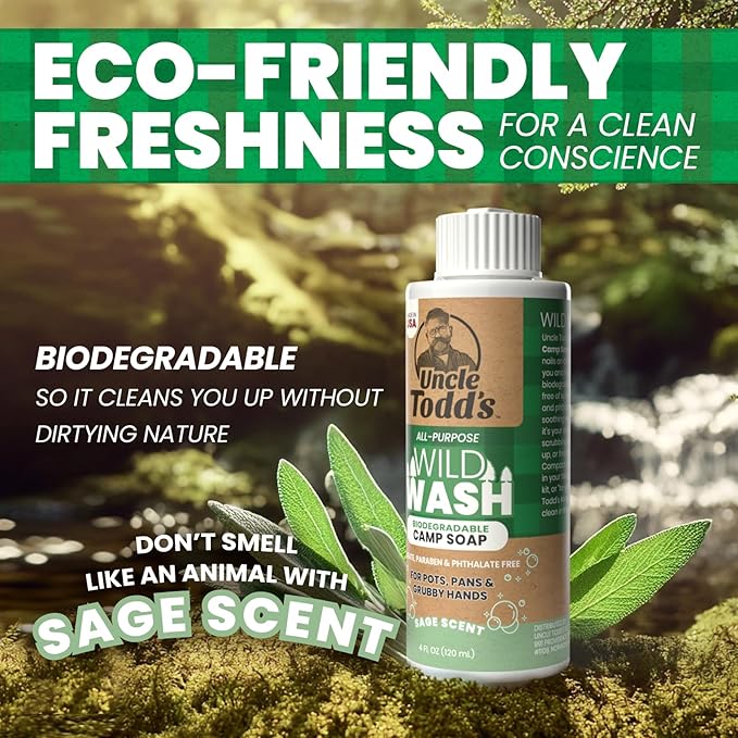 Uncle Todd's Wild Wash Biodegradable Soap, Camping Soap Ideal for Dishes, Body, Hands, and Clothes - 4oz, Sage Scent