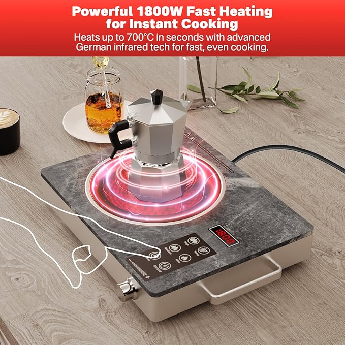- 【PRECISE & FLEXIBILITY COOKING】Equipped with 18 adjustable power and temp levels, the rotary knob control lets you fine-tune every dish—more natural than touch-control hotplate. The built-in timer ranges from 1 minute to 3 hours, making the portable infrared cooker perfect for both quick meals and long simmers.