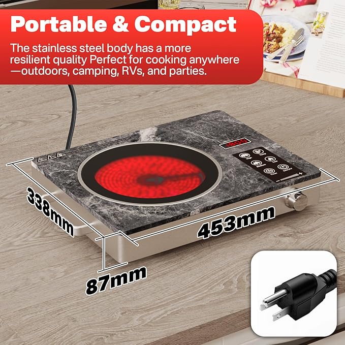 - 【COMPACT & PREMIUM MATERIALS】Designed with dual carry handles and sturdy feet, this compact electric cooktop fits small kitchens, dorms, and caravans. The durable stainless steel body and stylish marble-patterned glass surface bring both longevity and elegance to your space.