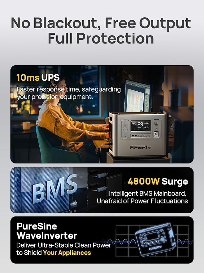 - 2400W Output for All Your Essentials:With a robust 2400W output (4800W surge) and 16 versatile ports, the AFERIY P210 can power everything from full-size refrigerators and medical devices to laptops and portable coolers. Whether you're at home during a power outage, on an RV adventure, or working off-grid, this portable power station is your reliable energy source.
