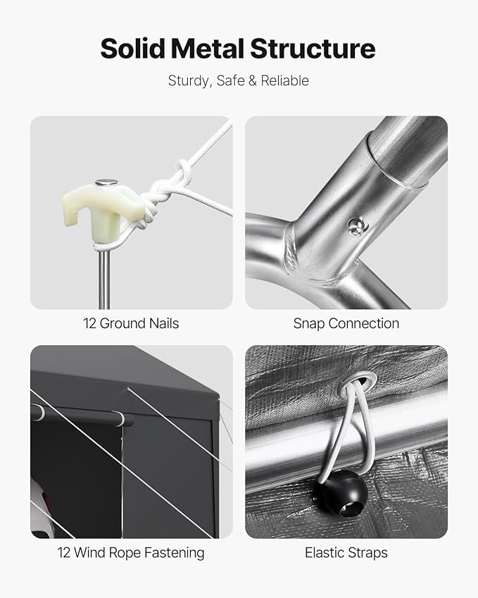 - Strong and Durable Materials: Made with galvanized steel pipes, the frame resists rust. The car canopy comes with alloy steel frame that is stronger and more durable than regular steel, able to withstand higher wind pressure and heavier weight, ensuring long-lasting use. Equipped with wind ropes and ground stakes for added stability in windy conditions.
