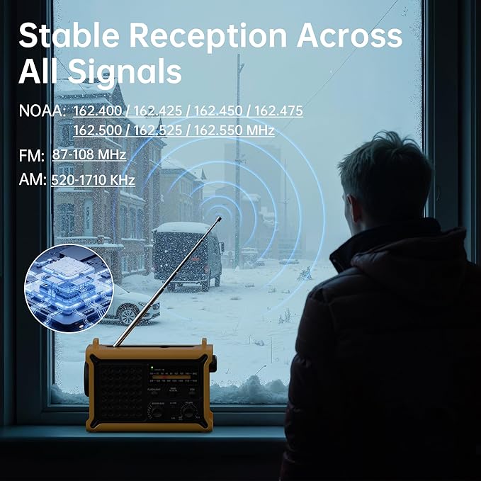 - ใReliable ๐ก๐ข๐๐/๐๐ /๐๐ Reception with Clear SoundใWith a high-sensitivity signal chip, noise-reduction circuitry, and an extended antenna, the radio ensures ๐ณ๐ฎ๐๐, ๐๐๐ฎ๐ฏ๐น๐ฒ ๐ฟ๐ฒ๐ฐ๐ฒ๐ฝ๐๐ถ๐ผ๐ป across NOAA FM AM bands. Whether you're sheltering during a storm or camping off the grid, you'll hear every update loud and clear.