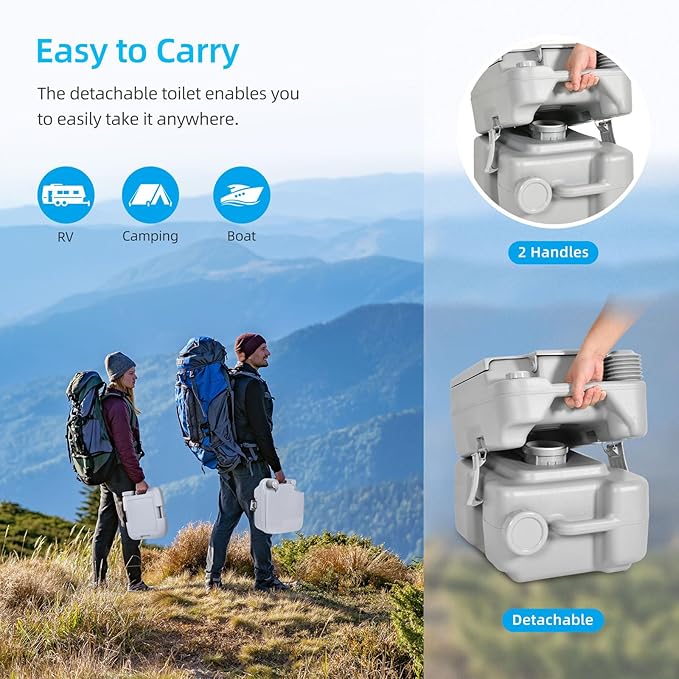 - Odorless & Convenient: Eliminate unwanted smells with confidence. Our portable camper toilet features an airtight slide valve that traps odors & contains waste. The ergonomic tank handle ensures easy mobility, making transport and setup effortless