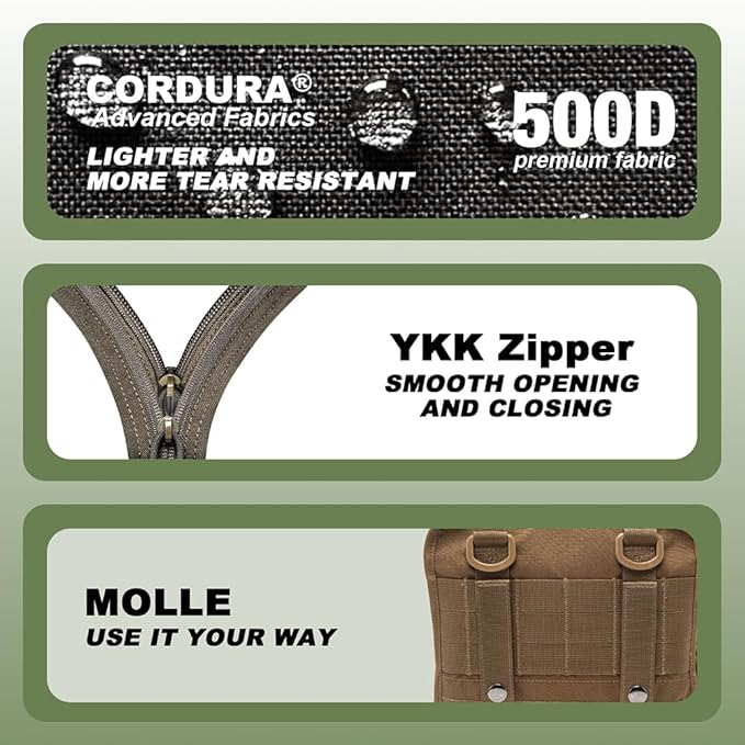 - Clam Shell Design: There are YKK two - way zippers to close the molle pouches, allowing you to open up completely to the bottom to access its two internal pockets. Additionally, a paracord with a retractable buckle is included, allowing you to adjust the opening angle to your preference. CORDURA 500D nylon fabric assure robustness and durability in the field
