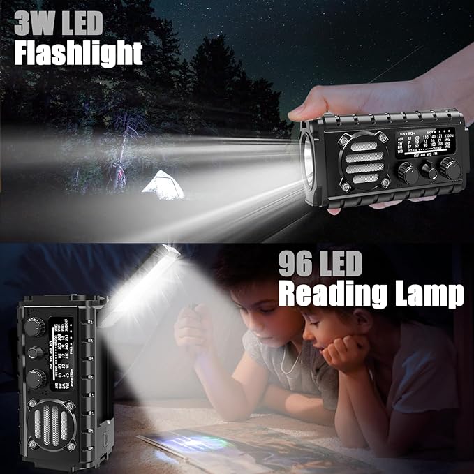 - [Multi-function emergency radio ] 96LED Warm Light + 120dB SOS Alarm--Dual lighting: 3W spotlight for search/rescue + 96LED low-blue reading lamp. Exclusive 120dB SOS siren (louder than jet engines) with reflective rescue strap. Audible/visual distress signaling for wilderness emergencies.