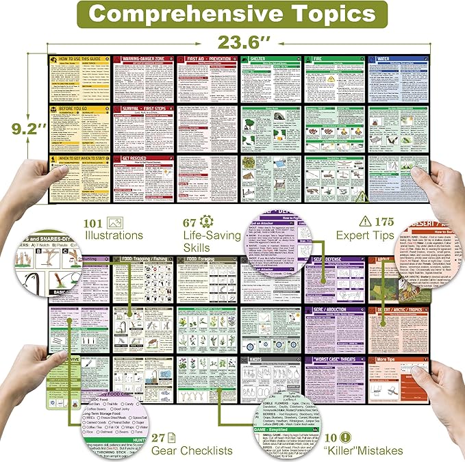 - Comprehensive Survival Information: Packed with 67 essential life-saving skills and 175 expert tips , this fold-out survival gear and supplies component covers critical topics from first aid and water sourcing to shelter-building and natural disaster response, making it a reliable tool in any survival situation.