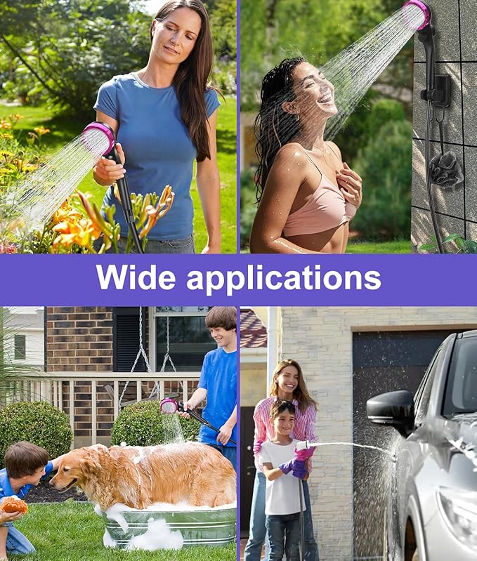 - Compact and Portable: Portable shower kit weights only 2.3LB, includes 1* Multi modes shower head, 1* Spray gun head, 1* Power water pump, 1* 6.7ft Water pipe, 1* Multi-use hook, 1* Type-C charging cable, and a Mesh organizer bag for convenient to carry and store. Ideal for indoor/outdoor showers, camping, BBQ, hiking, beach, trips, bathing, pet bath, car washing, plant watering and more indoor outdoor use