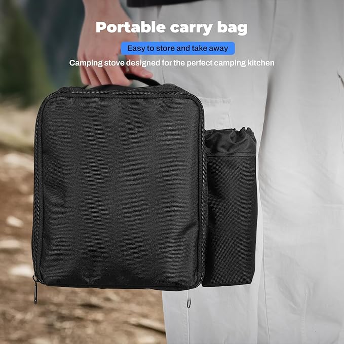 - PORTABLE AND COMPACT: Innovative folding design means this portable folding camping stove is very easy to carry and all major components are easy to disassemble and assemble. The folded size is only 9.45 x 8.27 x 4.53 in. It comes with a convenient carrying handle and storage bag for easy portability, perfect for camping, tailgate parties, picnics and other outdoor activities. It is compact enough to fit in your car without taking up too much space