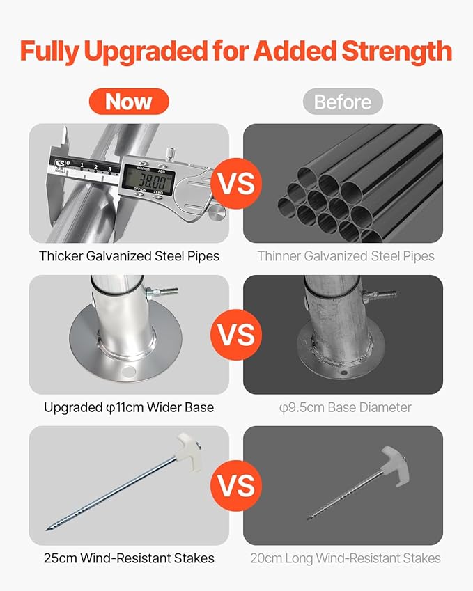 - Heavy-Duty Metal Frame: This large 10x10 ft portable storage shed is built with galvanized steel pipes, with a pipe diameter of 38mm and wall thickness up to 0.7mm. This makes it resistant to cracking, peeling, rusting, and corrosion, ensuring stability and security even in harsh weather conditions.