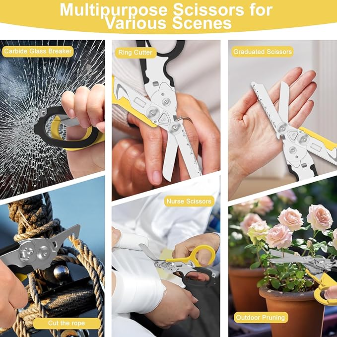 6 in 1 trauma shears, folding emergency shear, Outdoor Camping Tools, Seat Belt Cutter, Oxygen Cylinder Wrench, Complimentary Adjustable Wrench (Black Yellow)
