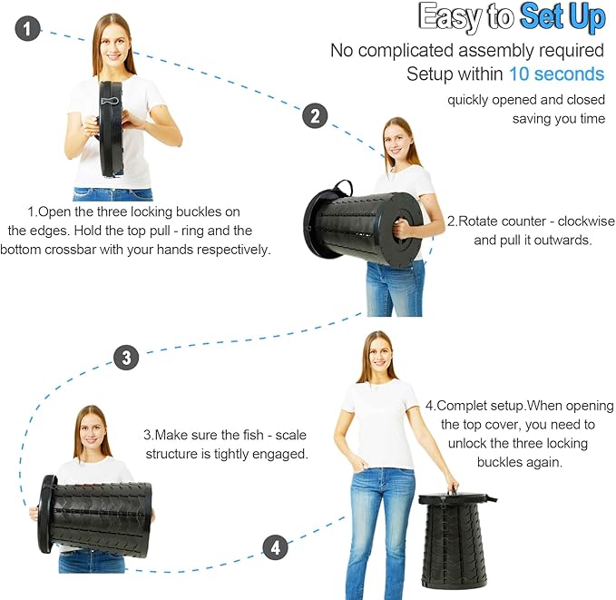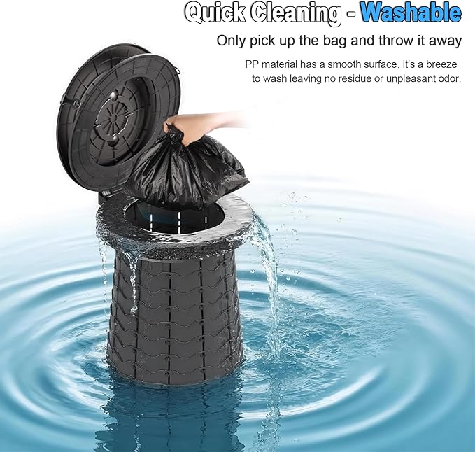 - MULTIFUNCTIONAL APPLICATION: Beyond a collapsible portable toilet:✅ Sturdy stool (14.4" extra-wide seat)✅ Trash bin✅ Temporary desktop.One device for camping/emergencies/travel.