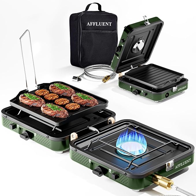 - PORTABLE AND FOLDABLE DESIGN: The Affluent dual - burner propane camping stove, complete with a grill and storage bag, is an outdoor essential! It's foldable, making it easy to stow in your car or backpack, perfect for camping and barbecues. Despite its compact size, it doesn't skimp on functionality. With two adjustable burners, you can cook multiple dishes simultaneously. The piezo ignition system ensures a quick and hassle - free start, making it a reliable choice for all your outdoor cooking needs.