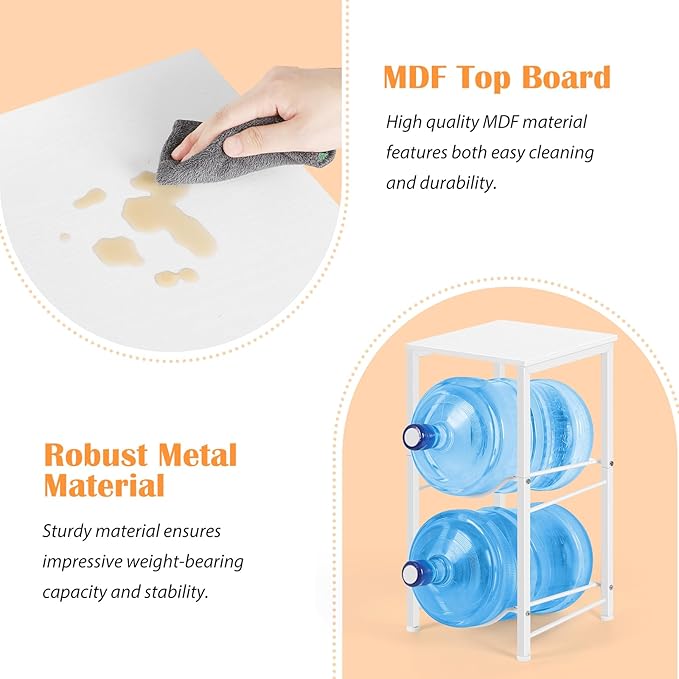 - 【5 Gallon Water Bottle Holder】: More than just a water dispenser stand rack—this water bottle storage organizer comes with a 13" L x 13.4" W MDF top shelf. Use it as a coffee station, pantry table, kitchen essentials storage, or to display your favorite mugs.