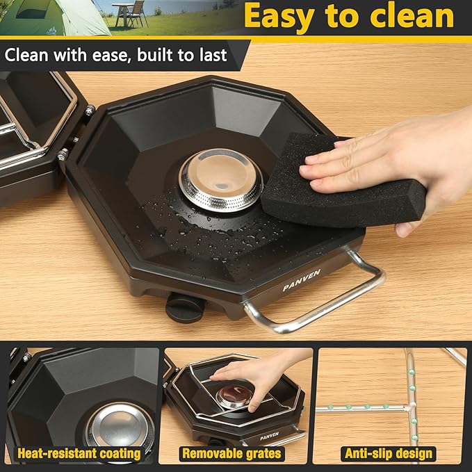 - Durable and safe: The portable gas stove is made of corrosion-resistant materials and has a heat-resistant coating on the top surface, ensuring long-lasting durability and effortless cleaning. The anti-slip design of the stove grates can firmly hold pots, pans, and bowls without slipping, making it safer to use