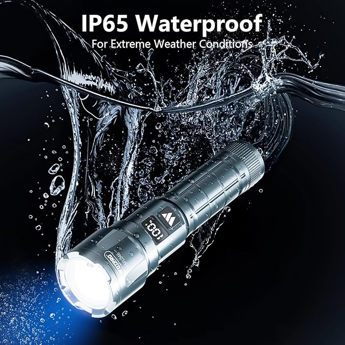 - Sturdy & IP65 Waterproof: Crafted from high quality, aerospace grade aluminum with a hardened anodized finish, this tactical flashlight offers superior shock resistance and scratch protection. Led flashlight for IP65 waterproof rating and integrated rubber sealing rings, it stands up to rain and snow without a problem. Whether you're night hiking or exploring the outdoors, this camping flashlight is built to be a trusted companion