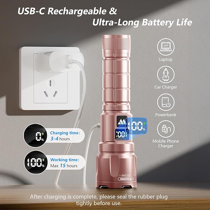- High Lumens LED Flashlights: WdtPro new SFL046 rechargeable led flashlight made of aerospace grade 6061 aluminum alloy, delivers an intense 6000 lumens of brightness and offers a wider beam range. Flashlights features an LCD battery indicator that shows remaining power in real time, so you always know exactly how much runtime you have left. When it comes to performance and value, the SFL046 outperforms every other tactical flashlight in its class, making it the perfect everyday lighting tool